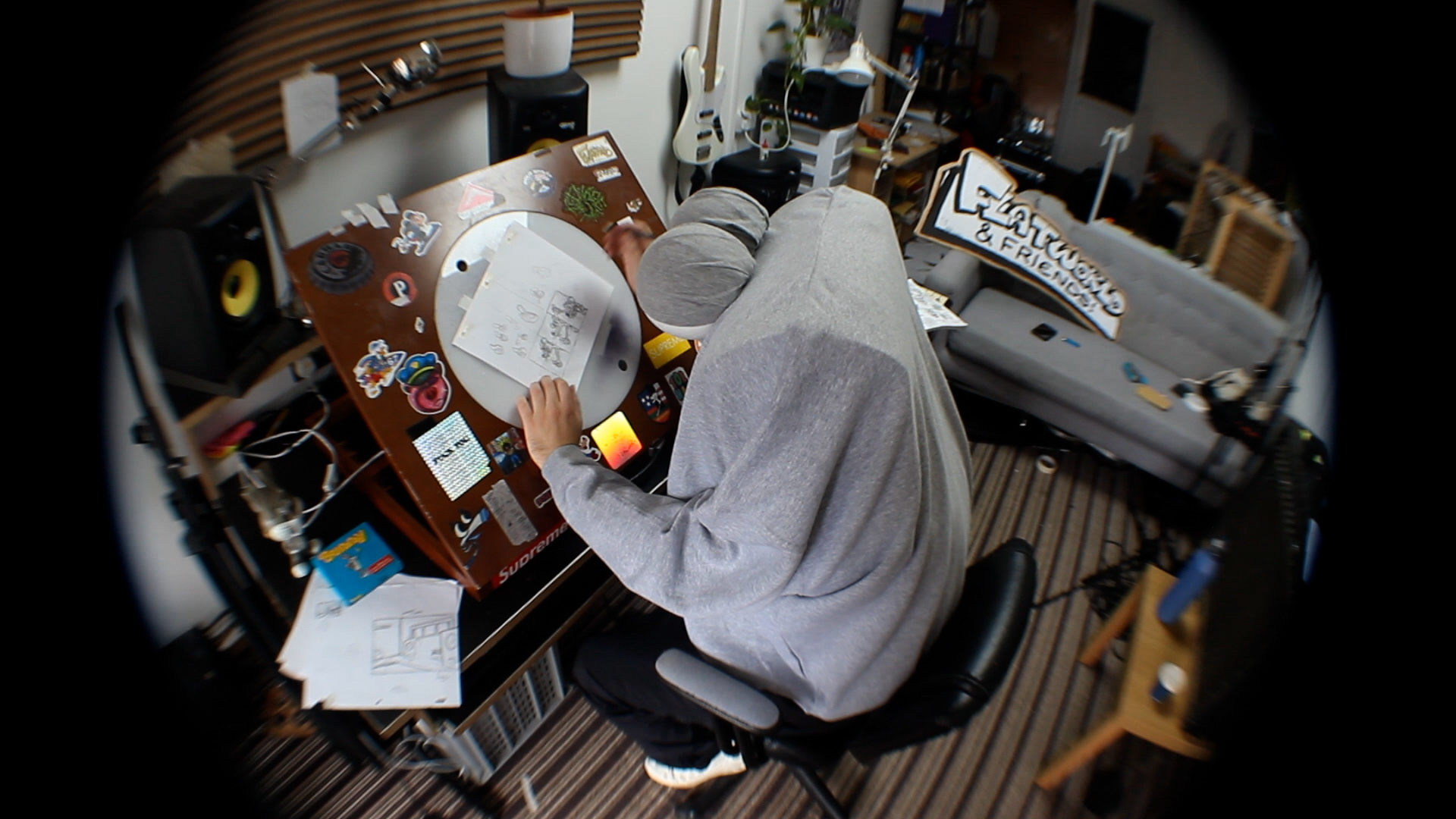 A poorly animated short presenting a man and a hand fight ing over which music to play!